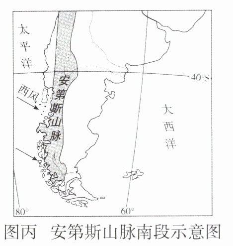 的气温高,冬季则相反。(3)图丙中安第斯山脉南段西侧为茂密的森林,东侧为荒漠草原,这是因为安第斯山脉阻挡了西风,西侧位于山脉的迎风坡,降水