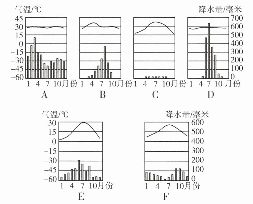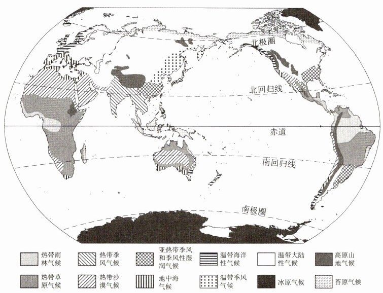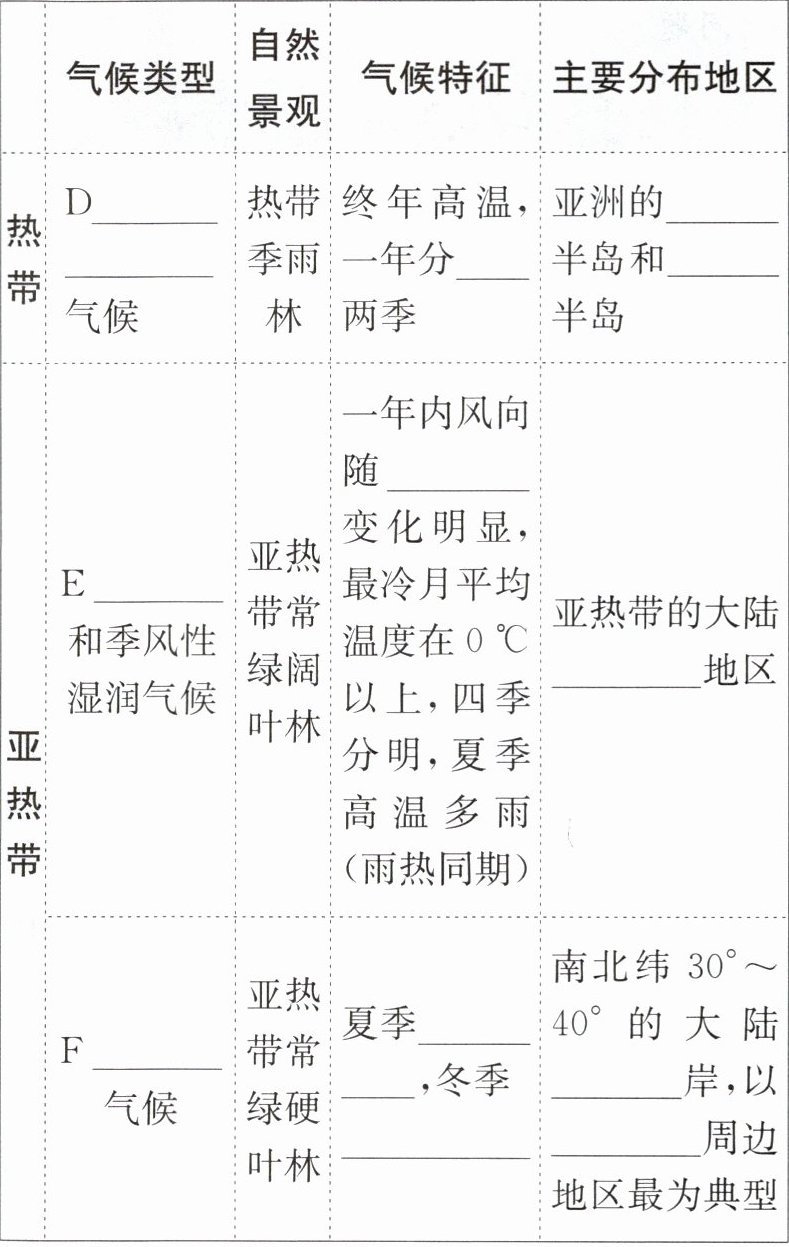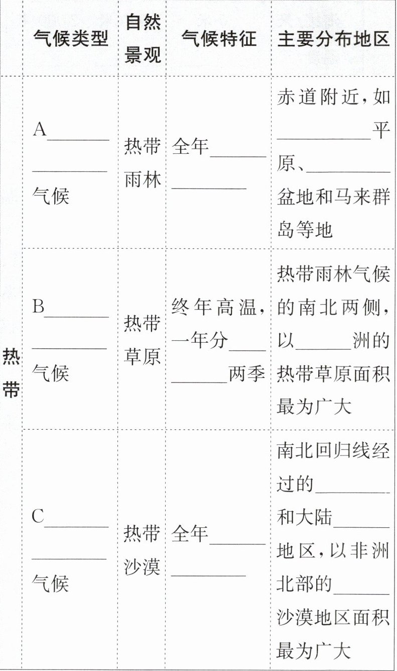 (自左往右,自上而下)热带雨林 高温多雨 亚马孙 刚果 热带草原 干、湿 非 热带沙漠 炎热干燥 内陆 西岸 撒哈拉 热带季风 旱、雨 印度 中南 亚热带季风 季节 东岸 地中海 炎热干燥 温和多雨 西岸 地中海