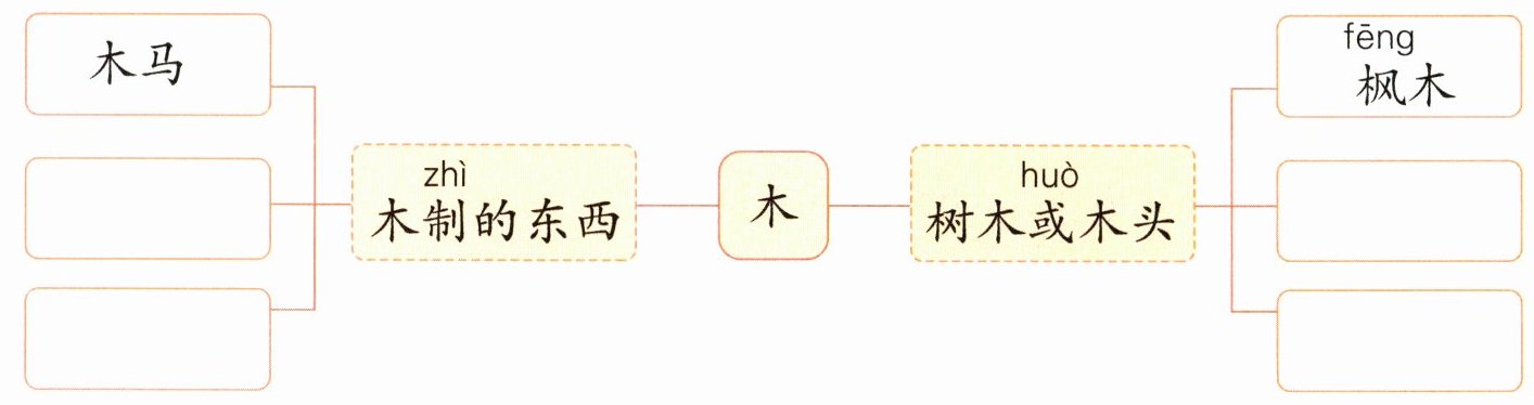 (示例)1. 左侧:木刀 木门 右侧:桃木 果木 2. 学生 生字 下雨 雨水