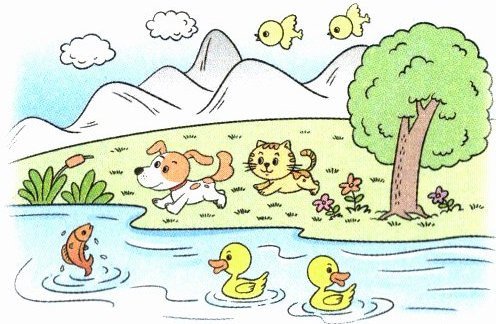 示例:1. 雪白 清清 绿色 大树 2.(1)鸟儿在天空中飞来飞去。(2)小狗和小猫在河边的草地上赛跑。