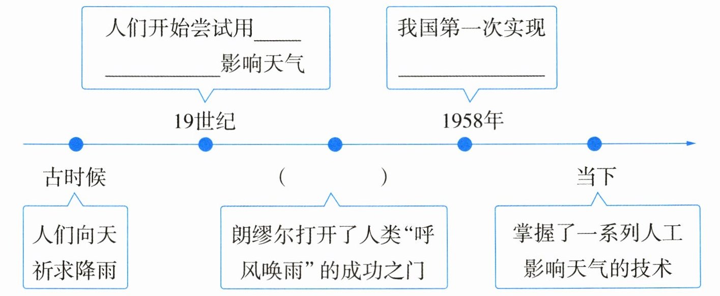 1. 新思维 逻辑梳理 人类“呼风唤雨”的梦想是如何一步步实现的?根据提示和短文内容,将下面的时间轴补充完整。(6分)