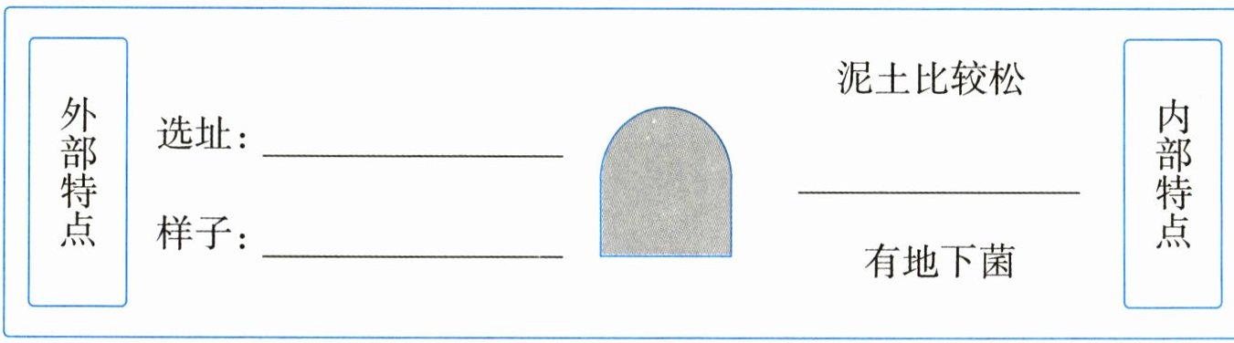 1. 外形 声音 2.(外部特点)选址:长满蘑菇的松树林 样子:门开着,洞口堆着泥土 内部特点:洞大约有几寸深,一直向下 3.(1)× (2)√ (3)√ 4. 甲虫在洞里啃食地下菌 5. 甲虫的洞是为了找食物而挖的临时宿舍,而蟋蟀的住宅是精心挖掘的供长期使用的住宅。 6. 示例:句 A 运用比喻的修辞手法,将甲虫比作“流浪者”“夜行客”,生动形象地写出甲虫漂泊不定、喜爱在夜间行动的特点,表达了作者对甲虫的喜爱之情。