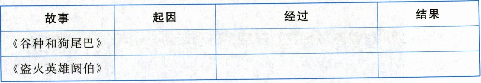 1. 让人们过上幸福日子 被砍掉八根尾巴 饿死 2. 天上的人不肯借谷种给地上的人 九尾狗去天上偷谷种带回人间,被砍断八根尾巴 人间有了谷子 人间没有火,人们日子过得很苦 阏伯带火种来到人间,天帝震怒,降下洪水 阏伯为保护火种牺牲,火种存留人间 3. 示例:阏伯为人类盗取火种,又因保护火种被活活饿死,他是一个善良、正义、舍己为人的英雄。 4. 示例:阏伯知道自己将要被贬下人间,就偷偷来到天火旁边,点燃了一条特意带来的粗草绳。他吹灭草绳的明火,只剩下暗火藏在身上,悄悄地把火种带到了人间。