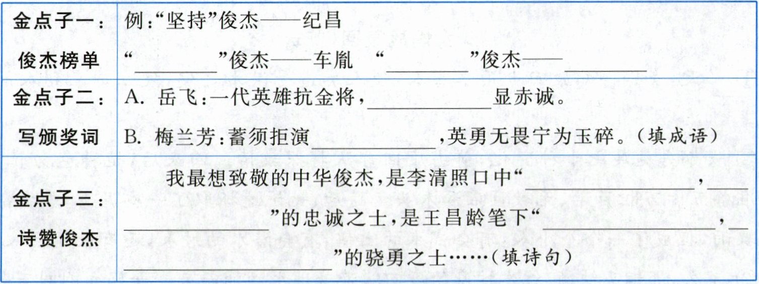 | 金点子三:诗赞俊杰 | 我最想致敬的中华俊杰,是李清照口中“______,______”的忠诚之士,是王昌龄笔下“______,______”的骁勇之士……(填诗句) |
