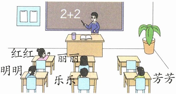 4. 红红想发言,她举起了( )手,她的后面是( );明明在乐乐的( )边,他在用( )手摸头;坐在教室最前排的是( )和( )。