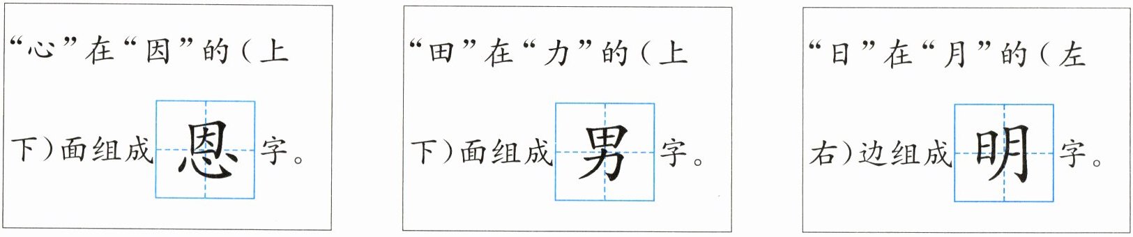 “心”在“因”的(下)面组成“恩”字。“田”在“力”的(上)面组成“男”字。“日”在“月”的(左)边组成“明”字。