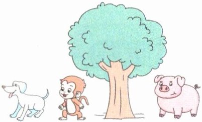 2. 小动物们排成一排,小狗排在第1个,小猪排在第5个,大树挡住了多少只小动物?