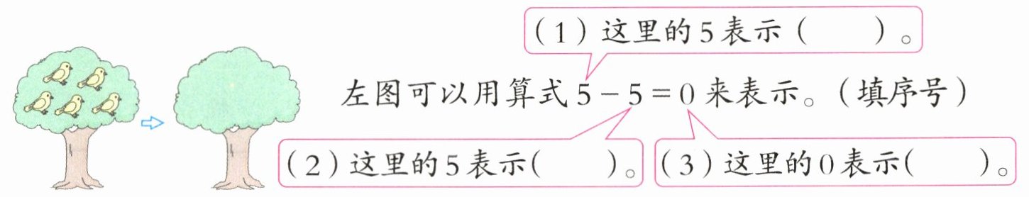 ① 飞走了5只鸟 ② 现在树上有0只鸟 ③ 树上原来有5只鸟