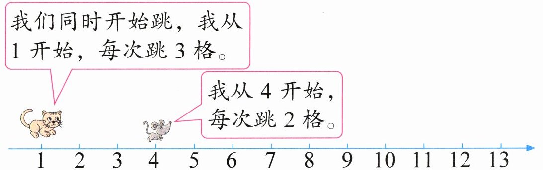 10 [解析:小猫从 1 开始,每次跳 3 格,分别能跳到 4,7,10,13。老鼠从 4 开始,每次跳 2 格,分别能跳到 6,8,10,12。因此它们同时跳,小猫跳到 10 时,正好追上老鼠。]