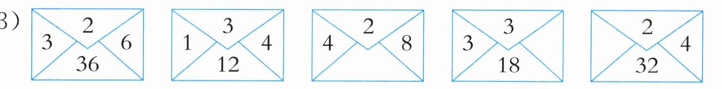 (1)42;49 (2)48;32 (3)64 2 4[解析:左面的数、上面的数和右面的数相乘,得到下面的数,即3×2×6=36,1×3×4=12,4×2×8=64。因此3×3×□=18,即9×□=18,可得□=2;△×2×4=32,即△×8=32,可得△=4。]