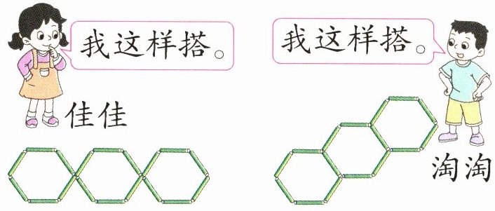 3. 佳佳和淘淘用小棒搭六边形。他们搭5个六边形各需要多少根小棒?(5分)