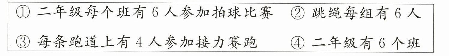 4. ① 二年级每个班有6人参加拍球比赛 ② 跳绳每组有6人 ③ 每条跑道上有4人参加接力赛跑 ④ 二年级有6个班