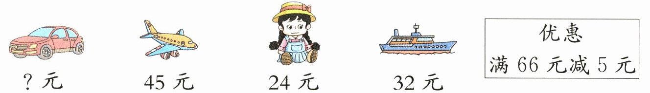 (3)答案不唯一,如:买一辆玩具汽车和一架玩具飞机需要花多少元? 27+45=72(元) 72>66(或66<72) 72-5=67(元)