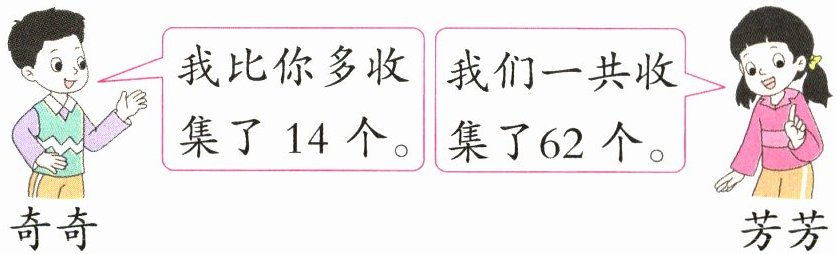 62+14=76(个) 76=38+38 奇奇:38个 芳芳:38-14=24(个)[或62-38=24(个)]