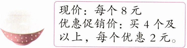 5. (南京溧水区期末)王阿姨原来准备买3个广彩瓷碗,她看到优惠促销时,改变了主意,花同样的钱买到了更多的瓷碗,她是怎样买的?(7分)