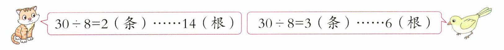 1. 30 根火柴棒最多可以摆几条独立的?还剩几根?下面( )算得对。(填“小猫”或“小鸟”)