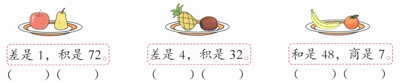 5. 新素养 推理意识 根据提示,判断每盘中的两个水果代表哪两个数,填一填。