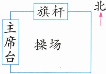 7. 如图为学校操场的示意图,主席台在操场的西面,升旗仪式上,主持人在主席台上与同学们面对面站立,这时他面向( ),同学们面向( )。旗杆在操场的北面,升国旗时同学们要向( )(填“左”或“右”)转,面向国旗敬礼。