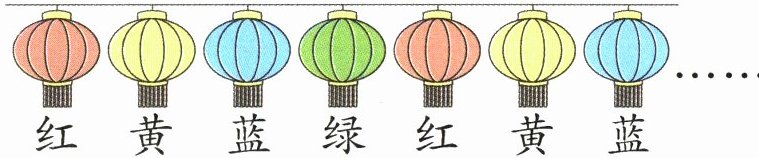 绿 黄 [解析:把“红、黄、蓝、绿”四个灯笼看成一组,32÷4=8(组),则第 32 个灯笼与每组最后一个灯笼颜色相同,是绿色的。50÷4=12(组)……2(个),则第 50 个灯笼与每组第 2 个灯笼颜色相同,是黄色的。]