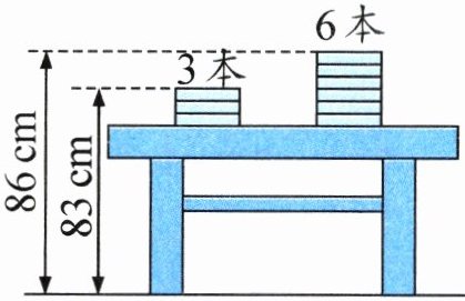1 80 [解析:由题图可知,两摞数学课本相差6 - 3 = 3(本),高度相差86 - 83 = 3(厘米),每本数学课本的厚度为3÷3 = 1(厘米),课桌的高度为83 - 3×1 = 80(厘米)。]