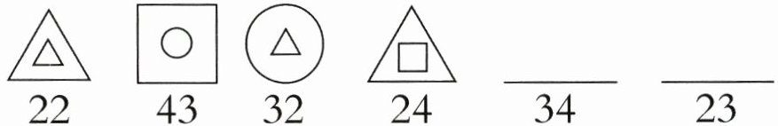1. 下面的每一个图形都是由$\triangle$、$□$、$◯$中的两个图形组成的。观察每个图形以及图形下面的数,发现规律,画出表示“34”和“23”的图形。(4分)