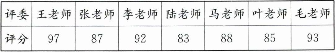 89 [解析:根据题表可知,最高分和最低分分别是 97 分和 83 分,去掉这两个分数后,剩余分数相加的总分是 87+92+88+85+93=445(分),进而可求出小乐的平均得分是 445÷5=89(分)。]