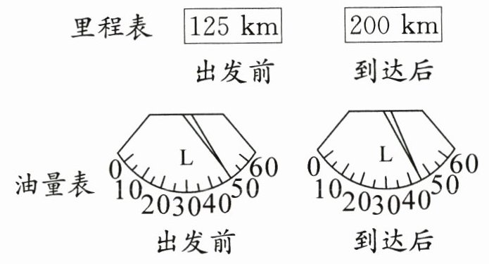 6. 周末亮亮一家开车去郊外游玩,在出发和到达时亮亮分别记录了汽车的油量表和里程表的数据(如图)。到达后汽车剩余的油量还能行驶多少千米? (6分)