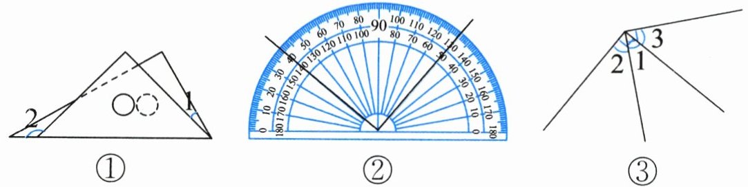)°。(2) 图②中,量角器量出的角是(