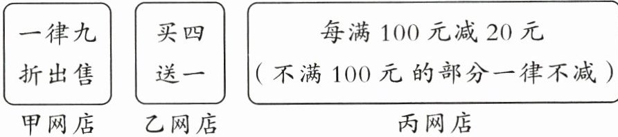甲网店:$50×69×90\% = 3105$(元) 乙网店:$50÷(4 + 1)×4×69 = 2760$(元) 丙网店:$50×69 = 3450$(元) $3450÷100 = 34$(组)……50(元) $3450-34×20 = 2770$(元) $2760<2770<3105$ 到乙网店购买最划算,一共需要2760元。