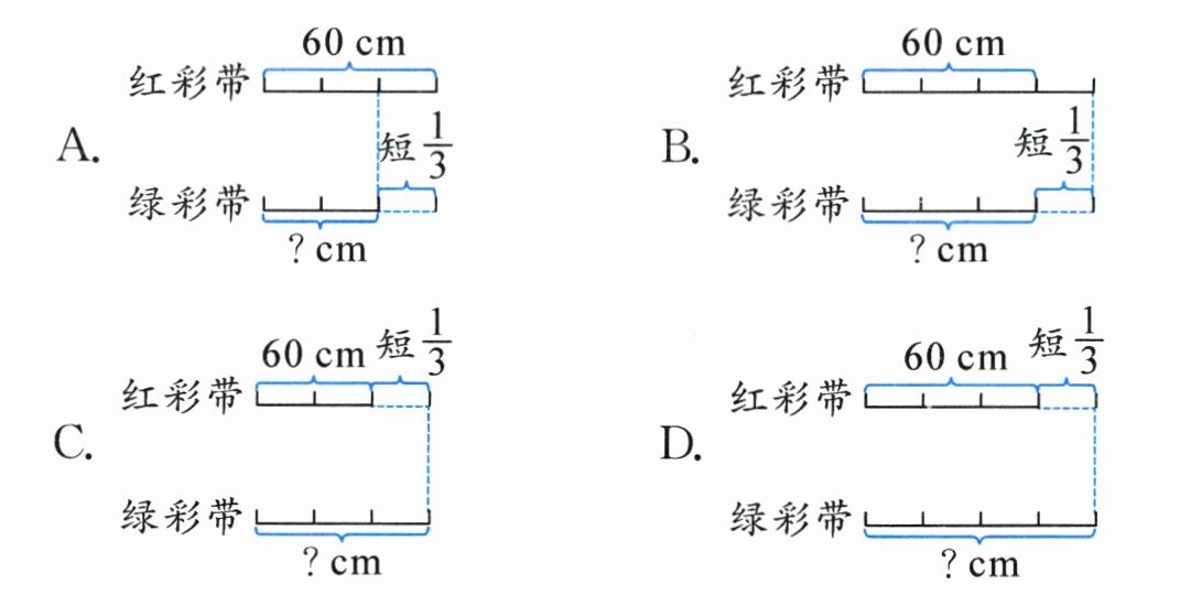 6. 有红、绿两条彩带,红彩带长60厘米,绿彩带比红彩带短$\frac {1}{3}$,绿彩带长多少厘米? 下面图