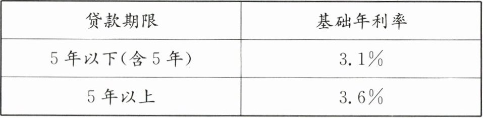 小明家今年购买了一套面积是100平方米的商品房,单价为15000元/平方米,并向银行申请了购房总额的20%的贷款,贷款期限为3年,到期后一次性还本付息,基础年利率如下表。银行5年以下(含5年)的贷款年利率会基于基础年利率下调5个基点,贷款到期时,小明家还给银行的利息总额是(