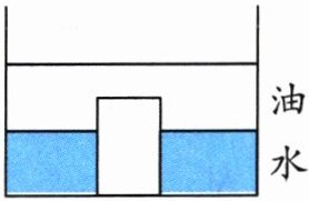 7 [解析:原来水槽中的水的体积是$16×12×6=1152$(立方厘米),放入铁块后,水的高度变为$1152÷(16×12-8×6)=8$(厘米),所以仍有$12-8=4$(厘米)高的铁块在油里,则油层增加的高度是$8×6×4÷(16×12)=1$(厘米),因此此时油层的高度是$1+6=7$(厘米)。]