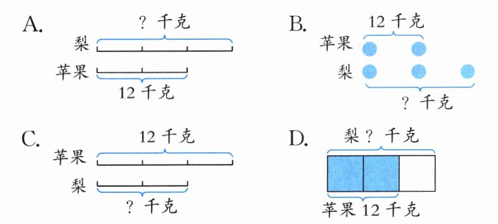 3. 新趋势 算理理解 一筐苹果重12千克,正好是一筐梨质量的$\frac {2}{3}$,用图表示苹果与梨数量关系不正确的是(
