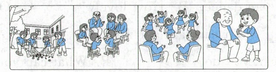 七 周末,三年级五班的同学在老师的带领下来到市区一家敬老院当起了小小志愿者。请选出与下列活动照相符的句子,在括号内画“√”。(3分)