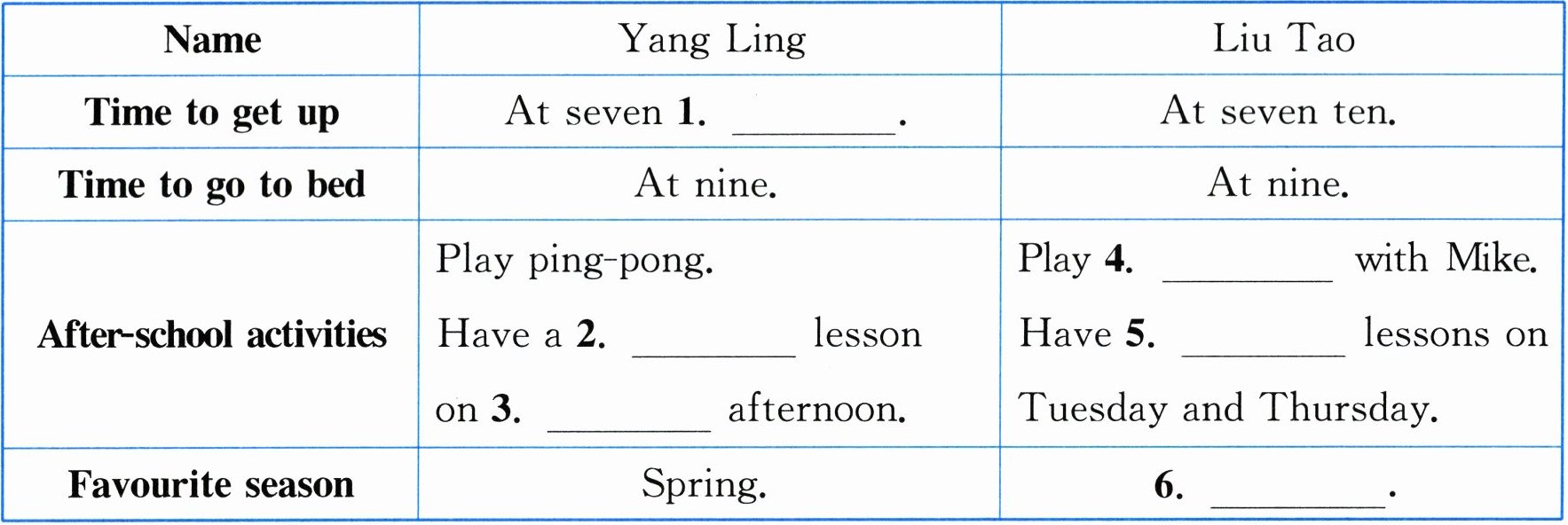 1. fifteen 2. dancing 3. Wednesday 4. basketball 5. swimming 6. Autumn