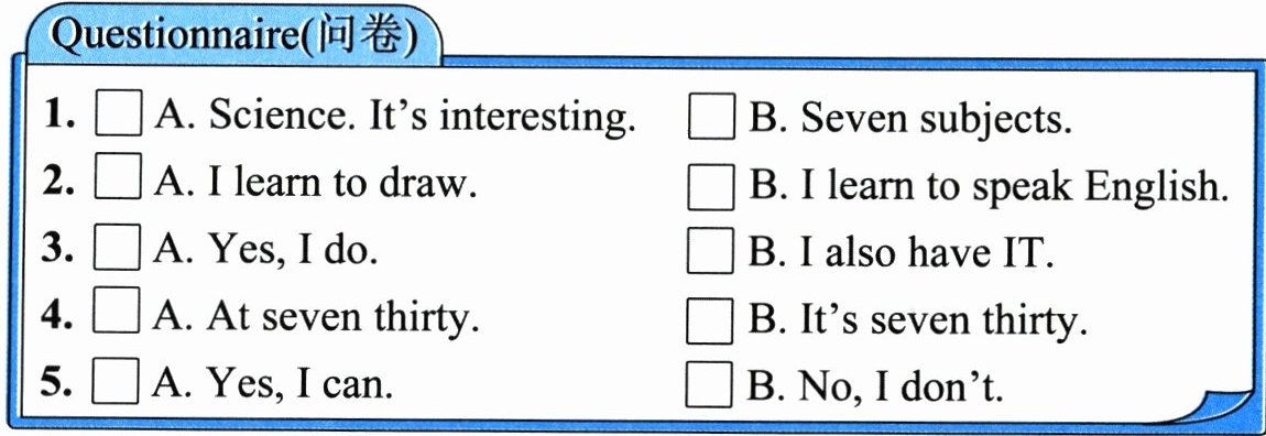 二听两遍录音,在调查问卷上勾选出合适的答句。(5分)