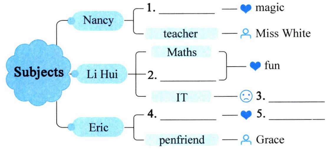 subjects at school. They are Chinese, Maths, Art, Music, English, PE and Science