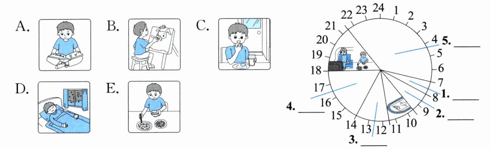 五 听两遍录音,选择正确的图片补全李华一天的作息图。(5分)