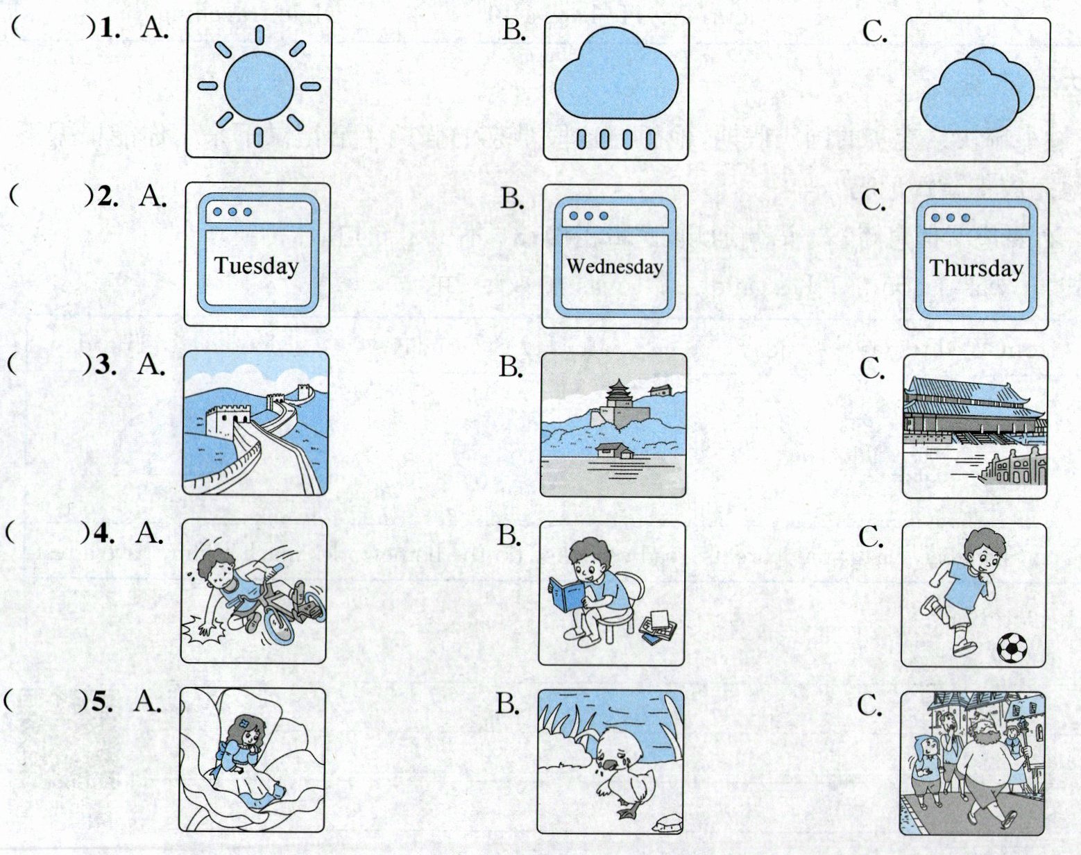 二 听两遍录音,根据所听对话及问题,选择正确的图片。(5分)