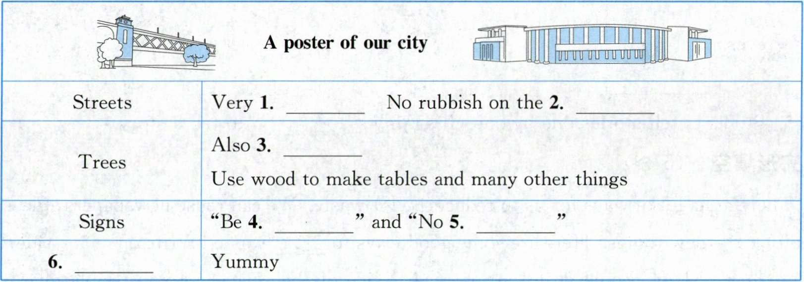 1. clean 2. ground 3. useful 4. careful 5. littering 6. Food