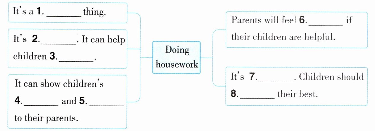 Second, doing housework can show children's care and love to their parents. Parents are usually very tired after work. They must feel happy if their children can help them with the housework.