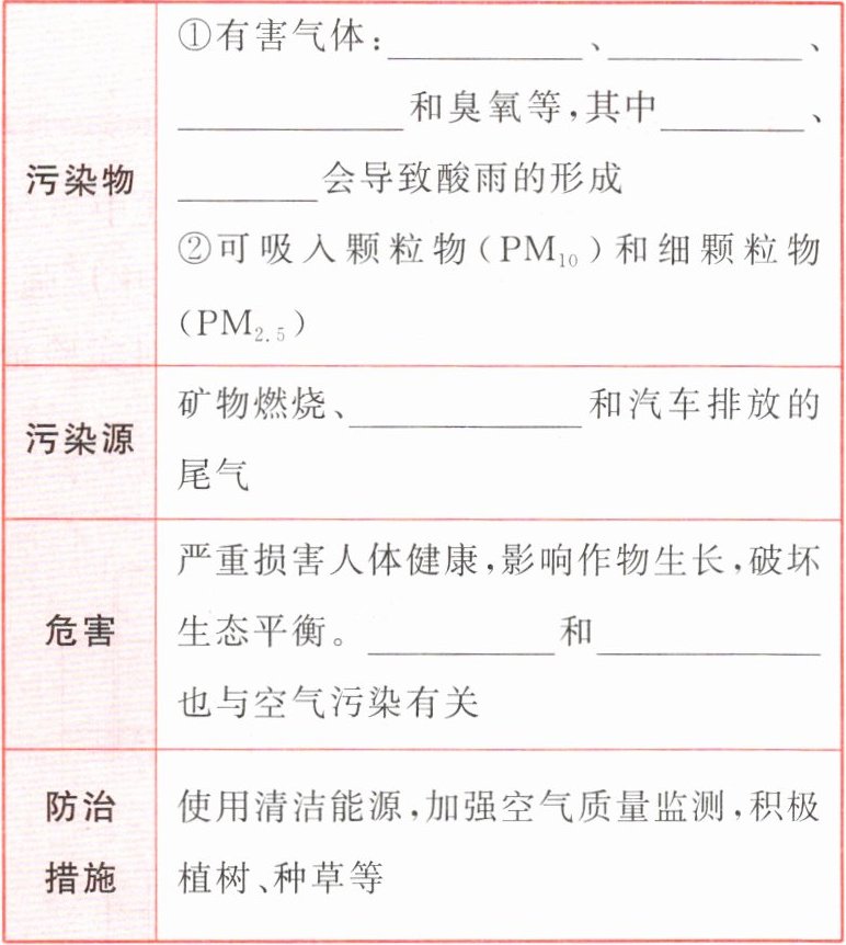 会导致酸雨的形成②可吸入颗粒物$(PM_1₀)$和细颗粒物$(PM_2._5)$||污染源|矿物燃烧、