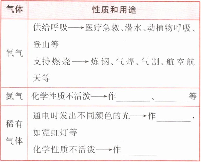 |氧气|供给呼吸→医疗急救、潜水、动植物呼吸、登山等支持燃烧→炼钢、气焊、气割、航空航天等|