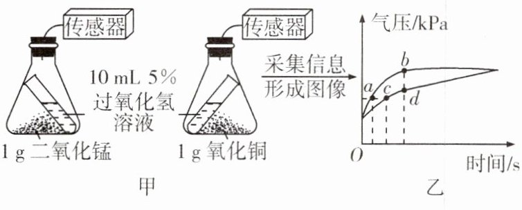 8. 按图甲所示装置进行实验,实验时倾斜锥形瓶使过氧化氢溶液与催化剂接触,瓶内气压的变化如图乙所示。请回答下列问题。