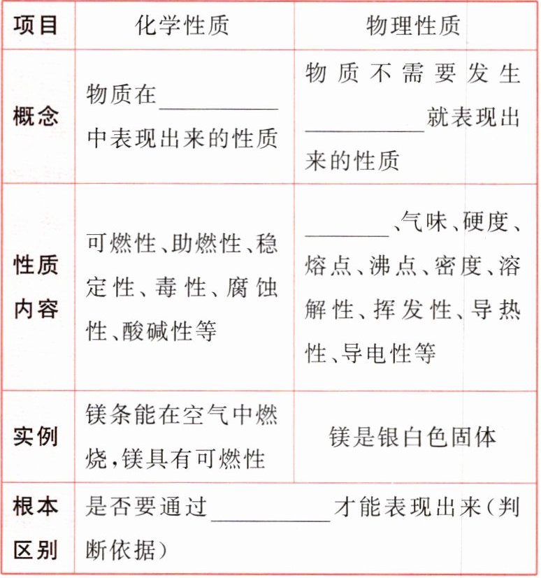 、气味、硬度、熔点、沸点、密度、溶解性、挥发性、导热性、导电性等||实例|镁条能在空气中燃烧,镁具有可燃性|镁是银白色固体|