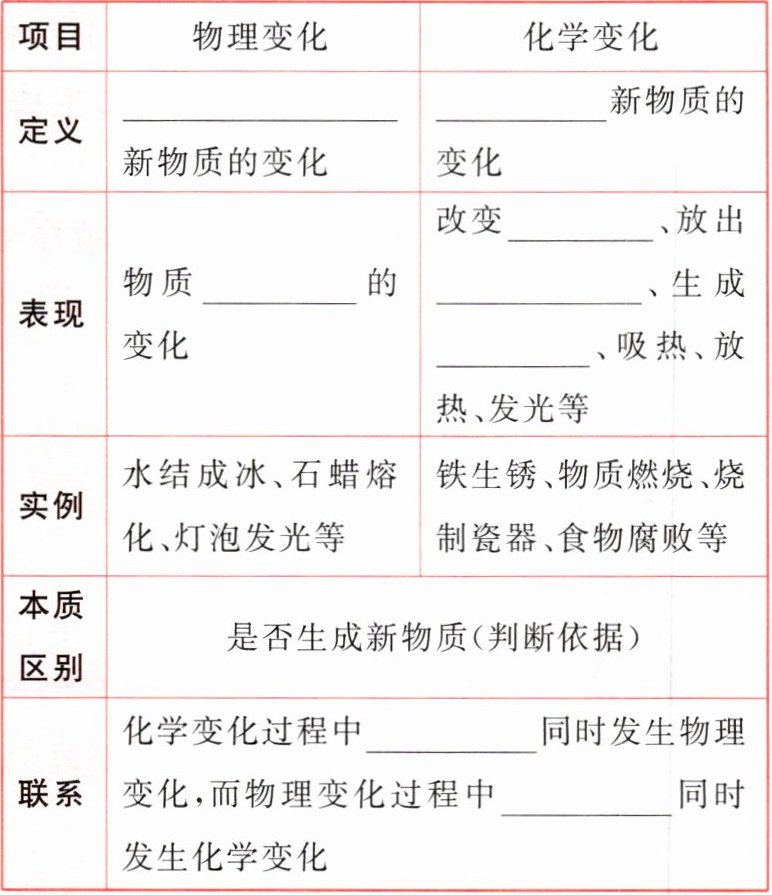 、吸热、放热、发光等||实例|水结成冰、石蜡熔化、灯泡发光等|铁生锈、物质燃烧、烧制瓷器、食物腐败等|