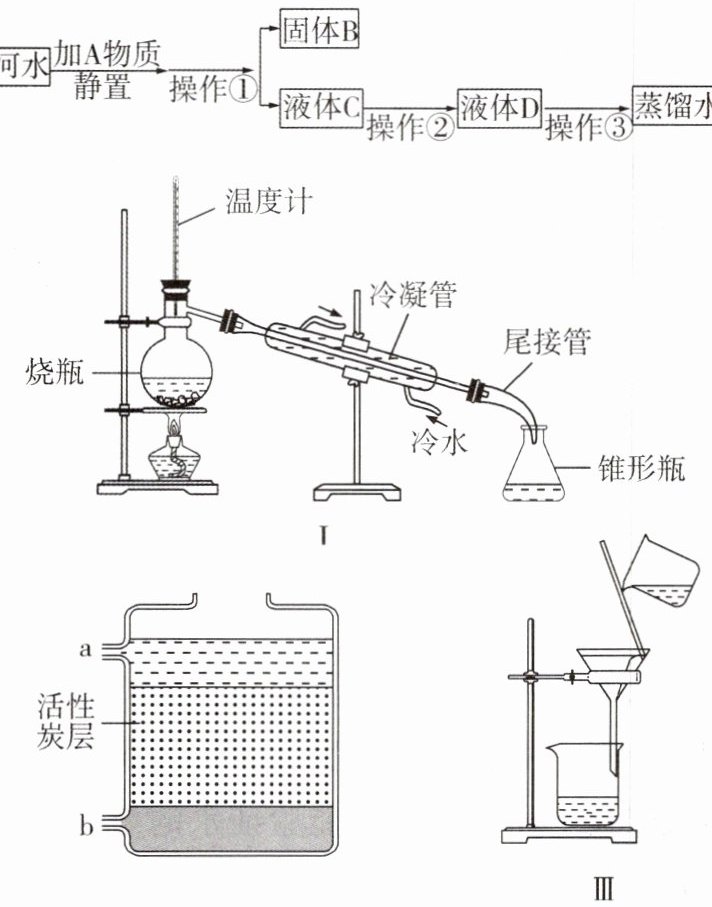 (2)操作②是在过滤后的液体C中进行的,图中提供了Ⅰ、Ⅱ、Ⅲ三种装置,其中Ⅱ是活性炭吸附装置,符合操作②的目的。该过程是物理变化,因为只是吸附了杂质,没有生成新物质。图Ⅱ操作中待净化的水应该从b端通入,这样可以使水与活性炭充分接触,净化效果更好。