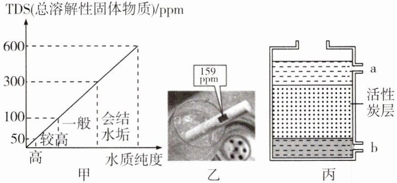 (填“高”“较高”“一般”或“会结水垢”)。(2)小组同学设计了图丙所示的活性炭净水器。活性炭的作用是
