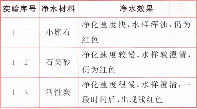 |1-1|小卵石|净化速度快,水样浑浊,仍为红色|