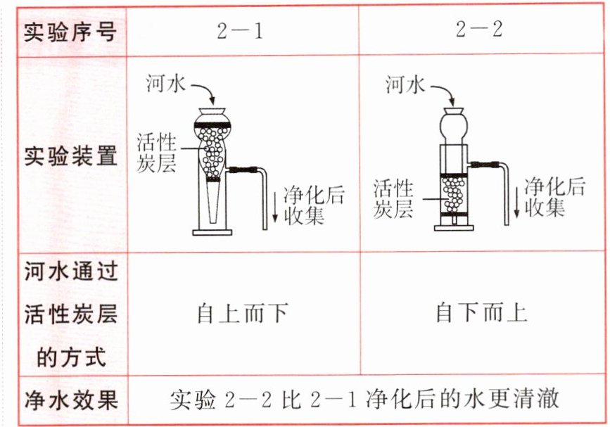 实验2:分别将相同流量河水注入填充等量活性炭的净化装置。实验记录如下: